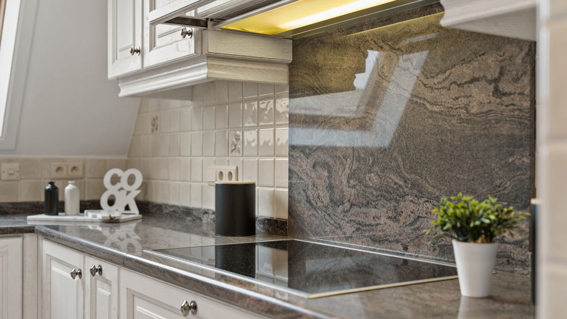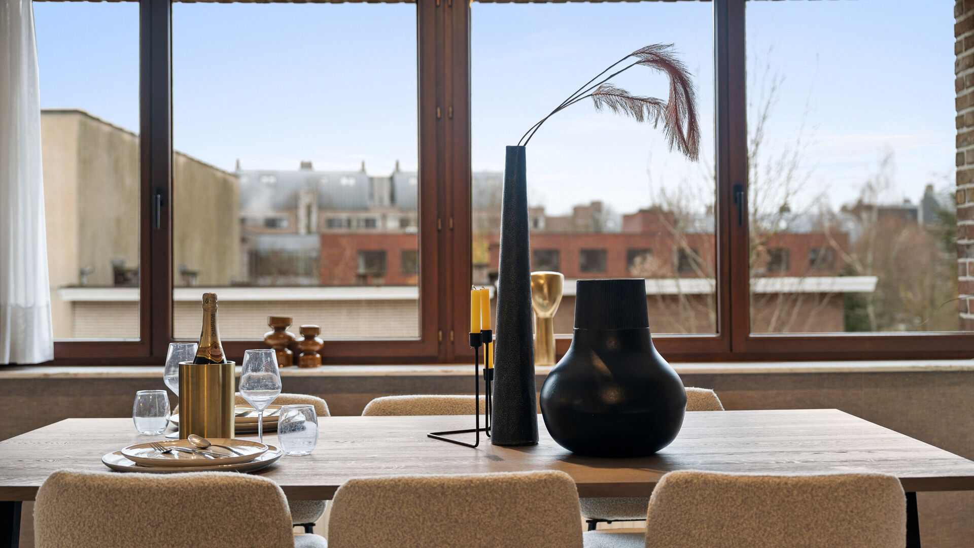 Aansluitend bevindt zich de ingerichte keuken, praktisch en functioneel ingericht en perfect geïntegreerd in het geheel.